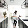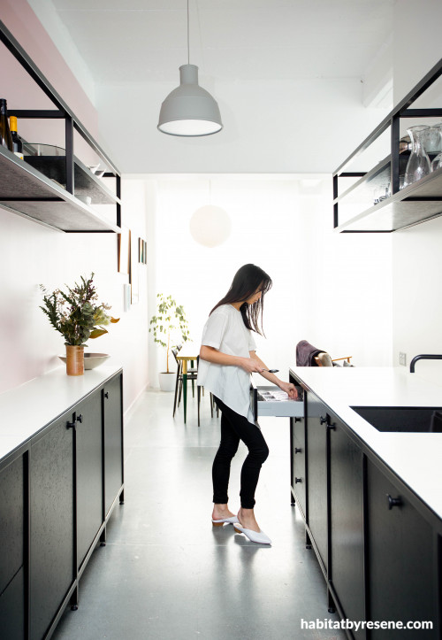 Finding satisfaction in discovering cost effective renovation strategies, the pair elevated common materials such as Strandboard for joinery and shelving. “As the new kitchen doubled as a thoroughfare, we wanted it to feel more akin to built-in furniture, without the toe kicks and melamine panels of conventional kitchens,” says Geordie. The Strandboard shelves were stained in Resene Pitch Black, using a lab grade compact laminate with black core for the kitchen benchtop and splashback. A steel frame system custom designed by the couple for their unique galley kitchen was fabricated by a local metal worker. They also repurposed robe hooks as drawer pulls. Geordie said it was challenging to stick to their small budget, but by finding creative solutions through repurposing materials they reduced expenses.