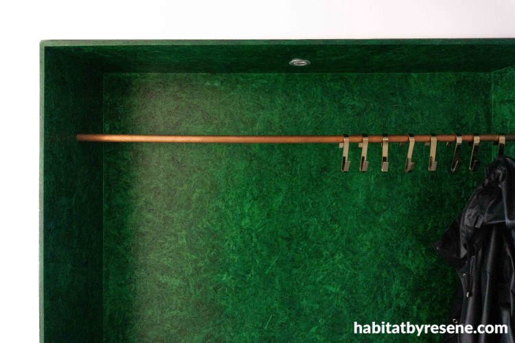 The creative addition of a colourful coat nook in the entryway creates depth in the space, stained in Resene Emerald Green.