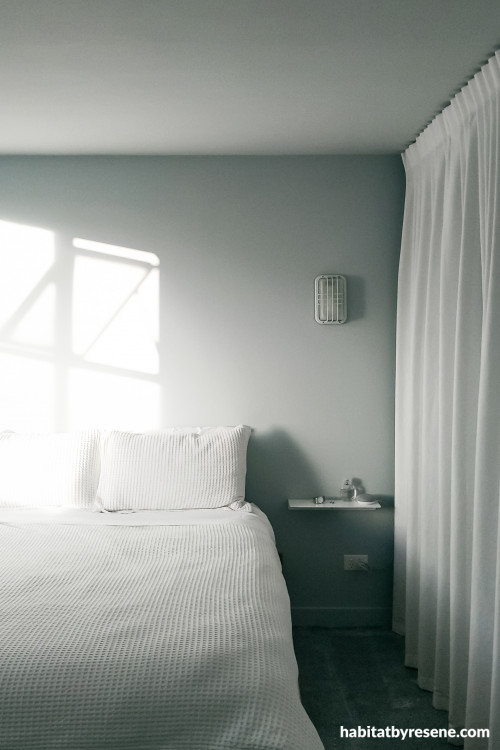 After tearing down the false ceiling, the apartment gained an extra metre of height which naturally opened up the space – once the decades of black mould growth underneath had been slowly scraped away. The unique concrete floor was also revealed once the carpet was pulled up, with interesting patching showing the years of use as a factory floor. A sliding door off the living room leading into the repositioned second bedroom gives the option for flexible, interconnected spaces. The living room and bedroom walls are painted in Resene Alabaster, a classic choice allowing for the natural light to stream through the steel-framed windows, stealing the show.