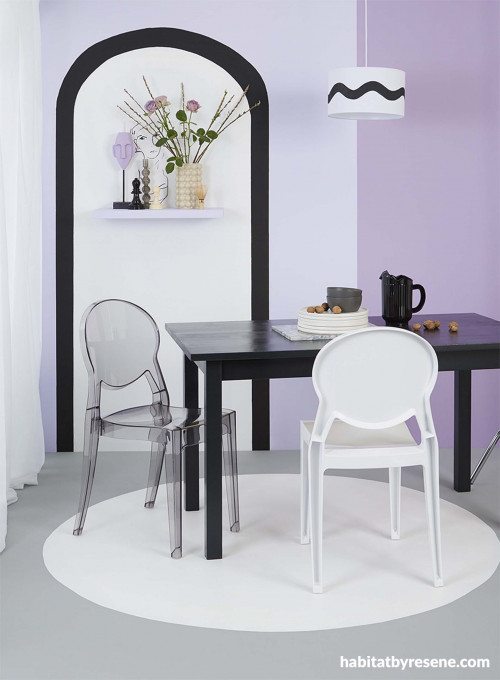 Vibrant and energetic, this dining room features walls in Resene Dreamtime (left) and Resene Mozart (right) with a Resene Black arch and Resene Alabaster inner. The floor is in Resene Half Stack with circle in Resene Alabaster and the table and lamp are in Resene Blackjack. Project by Kate Alexander. Image by Bryce Carleton.