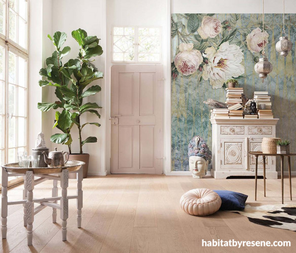 With great flowers comes great design. Immortalise those spring vibes in your home with a beautiful mural, such as Resene Wallpaper Collection P020-VD2, and introduce larger-than-life flowers that will bloom all year round. Wallpapers such as this are perfect for feature walls or used in small doses for maximum impact. This wallpaper’s muted teals, spring greens and dusty pinks make it the perfect companion to pre-existing vintage furniture or walls painted in warm whites and creams, such as Resene Villa White or Resene Alabaster. Introduce light timber features or large indoor plants to create a seamless connection to the natural world and keep the space feeling fresh.