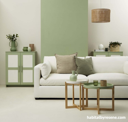 This spring lounge pairs neutral walls in Resene Eighth Fossil and floor in Resene Quarter Fossil with feature wall in Resene Norway. Coffee table and cabinets in Resene Norway with inner door panels in Resene Rice Cake and small coffee table in Resene Quarter Fossil. Sofa from Freedom. Project by Vanessa Nouwens. Image by Bryce Carleton.