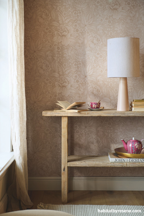 Resene Wallpaper Collection 333100 introduces a refined and natural look with subtle textures and warm tones. Team it with wooden furniture finished in Resene Aquaclear and flooring in Resene Colorwood wood stain.
