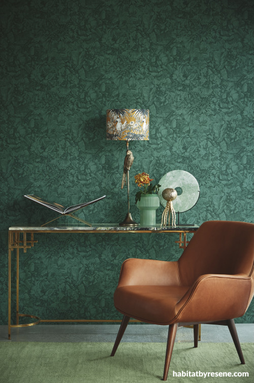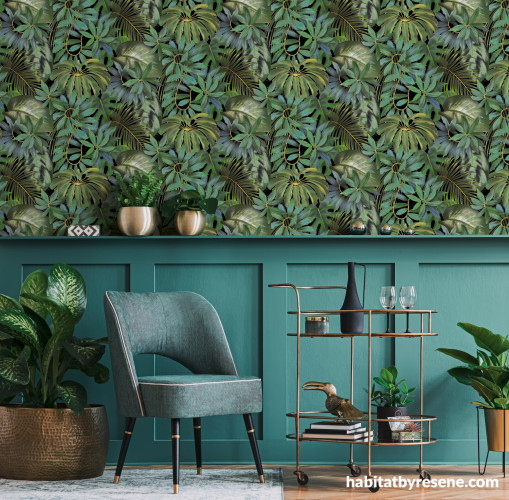 Florals have long been a favourite in interior design, and they’re not going anywhere! But if you’re after something fresh, Resene Wallpaper Collection E307345 brings a modern edge to traditional floral designs. Its rich jewel tones of emerald create a lush, dramatic backdrop that works beautifully in home offices, bedrooms or living areas. If you’re looking for complementary colours, try tan browns like Resene Nullarbor, deep purples like Resene Paua or shimmering metallics like Resene Gold Dust.