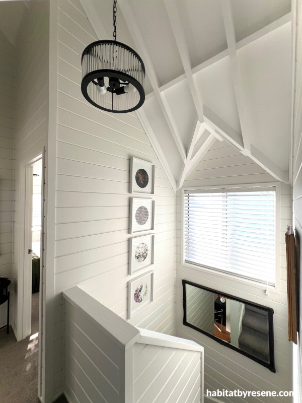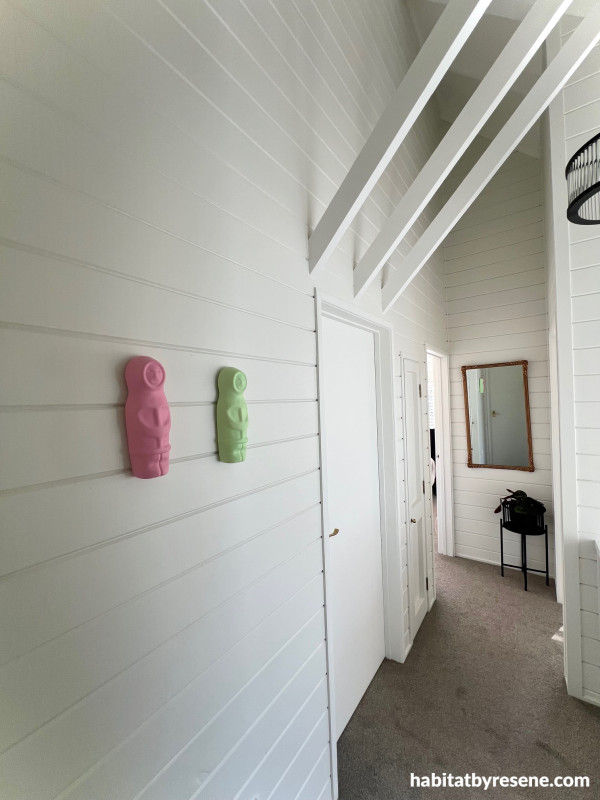 The stairs are dotted with simple artworks and quirky touches, showing off Karl and Tim’s personality and playful side. The fresh white backdrop has turned what used to be a dark corridor of orangey-brown timber into a bright, layered space that feels considered without being over-styled.