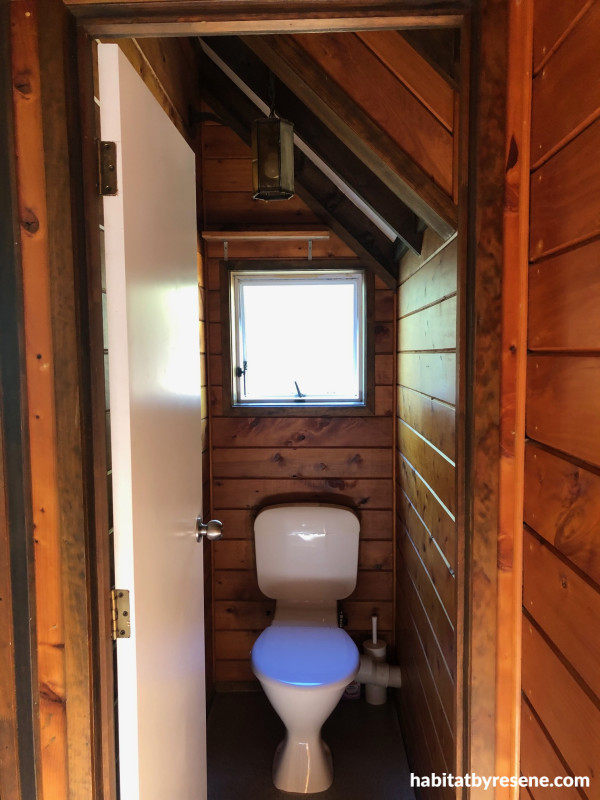 One of the most eye-catching makeovers is the vibrant green toilet, painted in Resene Fun Green. Once a dark and pokey room, it now pops with colour and character, helped along by a patterned monochrome floor tile and playful angles from the steep ceiling. It’s a brave use of colour in a tiny space, but it absolutely works!