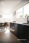 The fleecy hue of Resene Quarter Bianca brightens the kitchen and dining and provides a stunning contrast to the cabinets painted in Resene Gunmetal.
