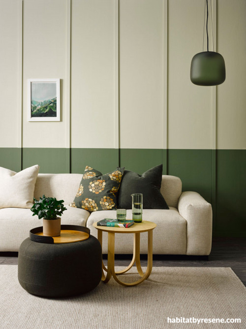Classic and contemporary combine in this alpine room with upper wall in Resene Zen and lower wall in Resene Woodland. Furniture from Cittá. Project by Amber Armitage. Image by Wendy Fenwick.