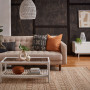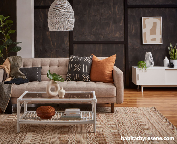 This cosy lounge has walls in Resene Colorwood Sheer Black with battens in Resene All Black and floor stained in Resene Colorwood Natural. The crisp sideboard and coffee table are in Resene Snow Drift and the pillar and the pendant light are in Resene Black White. Bloom 3-Seat Sofa in Sand from Nood, Home Republic Tierra Rust Rug from Adairs, throws and cushions from Citta. Project by Laura Lynn Johnston. Image by Wendy Fenwick.
