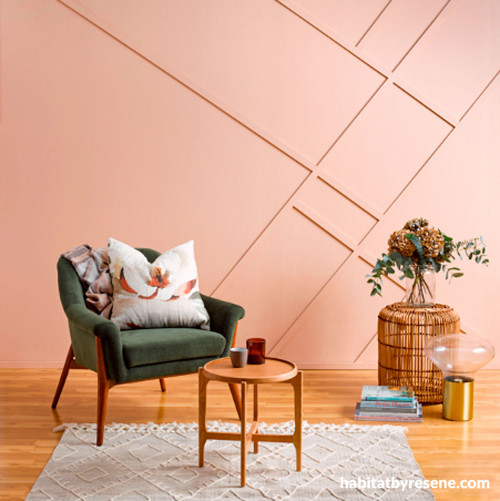 This room’s rosy atmosphere is created with a wall and battens in Resene Cashmere. The floor in Resene Colorwood Natural warms up the space. Rug, chair, cushion, lamp, and tables from Freedom Furniture. Project by Amber Armitage. Image by Mel Jenkins.