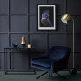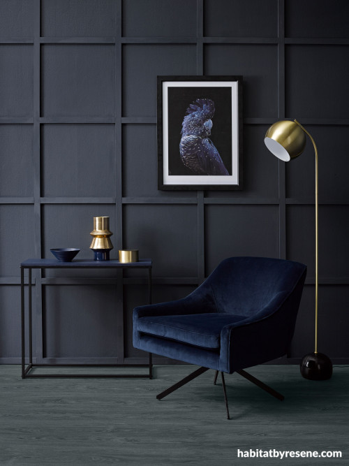 This moody Resene Twilight Zone wall uses a grid of battens to create a unique feature. The floor is in Resene Colorwood Mid Greywash over Resene Colorwood Crowshead, while the table is in Resene Indian Ink. Velvet chair from Nood and lamp from Freedom Furniture. Project by Vanessa Nouwens. Image by Melanie Jenkins.