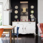 A nook in the dining room features a backdrop of Resene Nero paint to highlight a hand screen-print called NZ Chair by Deborah Bowness and a collection of vintage plates.