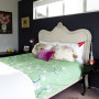 The bedroom has a striking feature wall in Resene Nero while the modern window blinds are given a vintage twist with a scalloped edge and fringing.