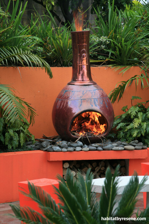 Gardens particularly suit global inspiration. Here, spicy orange walls in Resene Grenadier (top layer) and Resene Sorbus (bottom) sit behind a Mexican oven or chiminea.