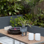 A Balinese-inspired setting with a low slatted table, pillar candles, bowls and Resene Gravel walls in the background. This is part of a garden featured in the latest issue of Habitat magazine.