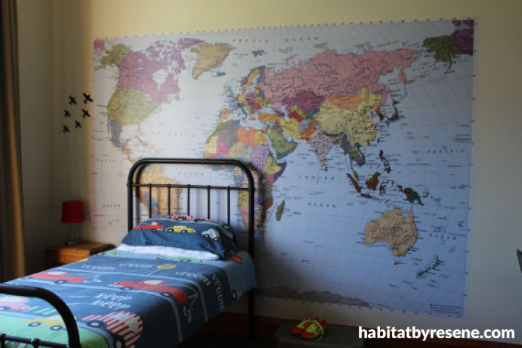 Five-year-old Oliver’s room is a wonderful combo of fun and education. He can satisfy his wanderlust without leaving home with Komar Photomurals Scenics World Map, available at Resene ColorShops, put over a wall painted in Resene Parchment. The cool metal bed is complements of his mum’s online store, www.temptinteriors.co.nz.
