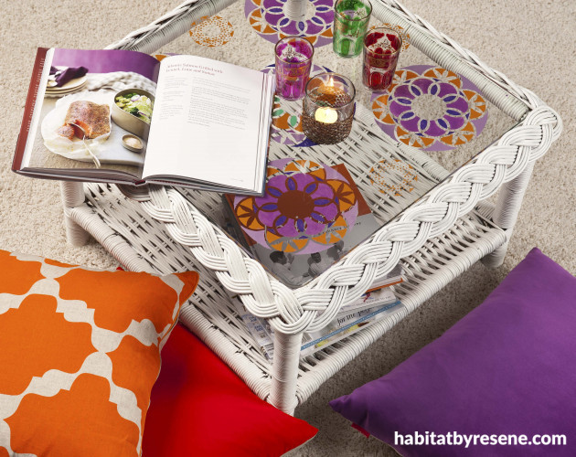 This Moroccan-inspired table was our fun step-by-step project in the latest Habitat magazine. It uses testpots of Resene Home Run (green), Resene Pukeko (purple), Resene Centre Stage (dark pink), Resene Butterfly (pale pink) and Resene Clockwork Orange stenciled through cake stencils. The cane is painted Resene Half Spanish White.