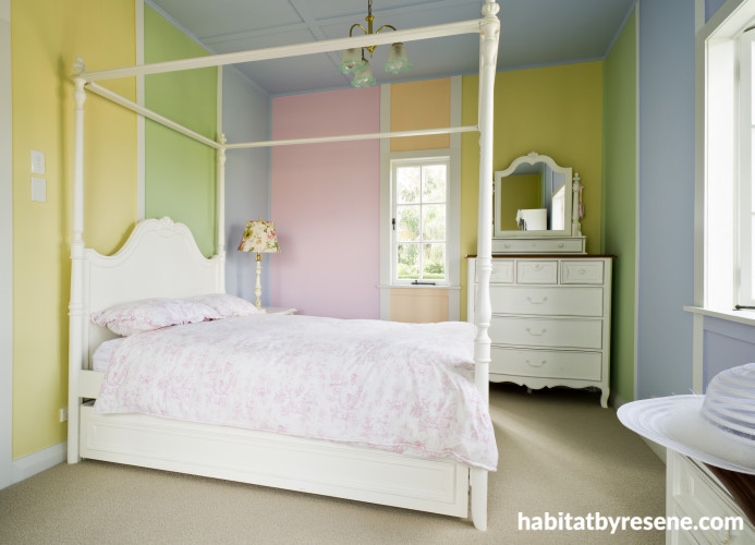 A more restful scheme but still summery and fresh is this one by designer Debbie Abercrombie inspired by a child's request for a 'rainbow'. Debbie interpreted this with panels in Resene Heartbreaker (blue/mauve), Resene Oxygen (ice blue) Resene Soft Apple (green) Resene Mellow Yellow, Resene Frangipani (pale orange) and Resene Pink Lace, with Resene Milk White trims.
