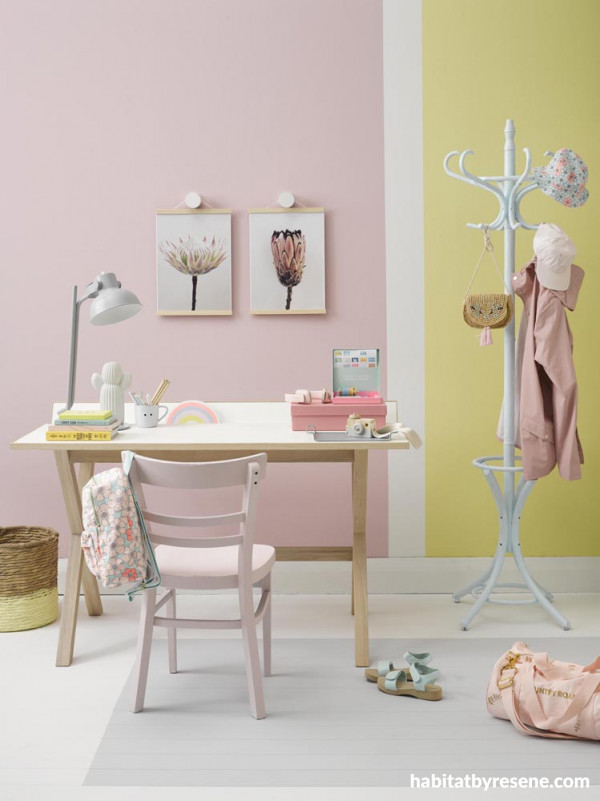 This quaint pastel desk set-up would definitely get Barbiecore fanatics’ nod of approval – it looks fit for Barbie herself. Walls in Resene Gelato, Resene Half Black White and Resene Moonbeam, floor in Resene Half Black White and Resene Geyser, skirting in Resene Half Black White. Coat stand in Resene Onahau, chair in Resene Vanilla Ice, basket half painted in Resene Moonbeam. Desk from Freedom Furniture, lamp from Citta, jacket from Father Rabbit, r Round hooks, camera, various books and pencils from Shut the Front Door, various stationery from Kikki K, bag and shoes from Country Road, art from Wall Flower Posters. Project by Emily Somerville-Ryan, image by Wendy Fenwick.