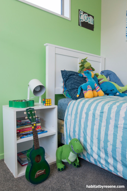 Their bedrooms are primarily painted in Resene Merino and then each has a feature wall in their chosen colour: Resene Space Cadet, Resene Kumutoto and Resene Tutti Frutti. These colours are bright and playful but because they are also all greens and blues, it create a restful atmosphere to wind down and relax in.