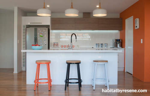 Resene Clockwork Orange was chosen as the feature in the main living area for its sense of fun and warmth. The other walls are painted in Resene Double Merino.
