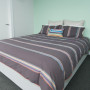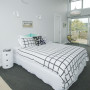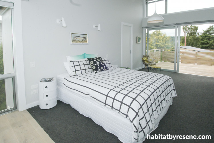 The main bedroom on the main floor of the bach has walls in Resene Concrete and a ceiling in Resene Alabaster.