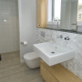 Small but perfectly formed, the bathrooms have fun hexagonal tiles, hoop pine plywood cabinetry, and Resene Concrete walls.