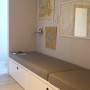 Framed maps sit above one of the strategically placed built-in daybeds which provide extra sleeping for guests as well as storage and enjoyable places to perch during the day.