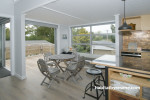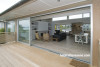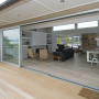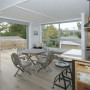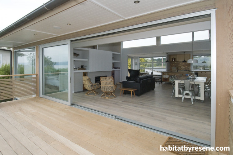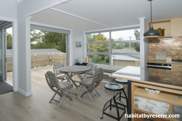 Looking through the dining area to the deck where the balustrades which have posts painted in Resene Alabaster, contrasted with horizontal cedar battens.