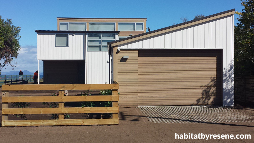 The layered forms of the house are further accentuated with two types and colours of cladding. Rusticated cedar horizontal weatherboards have been finished with Wood X oil stain in colour Avalanche, available through Resene ColorShops, alongside vertical shiplap painted in Resene White Pointer.