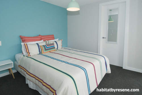Pops of colour were chosen for two of the bedrooms with feature walls in Resene Fountain Blue and Resene Vista Blue.