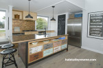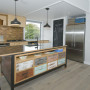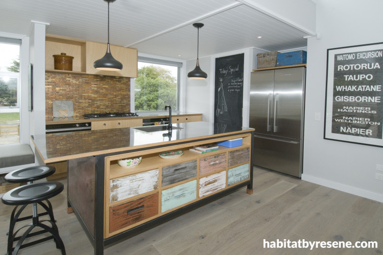 Decommissioned bee hives act as storage under the kitchen island bench while copper tiles and hoop pine cabinets continue the intriguing mix of materials. A noticeboard to one side is painted in Resene Blackboard Paint.