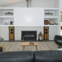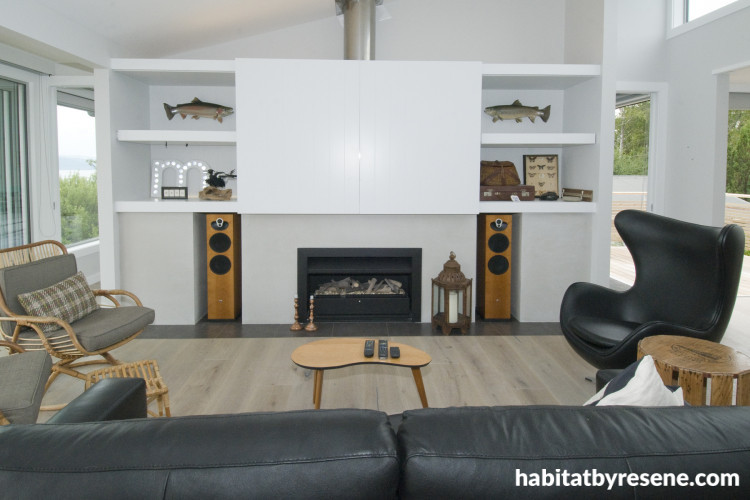 Sliding wall panels above the fireplace conceal the television and are grooved to refer to the exterior wall claddings. They’re painted in Resene Alabaster, against walls in Resene Concrete.