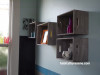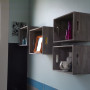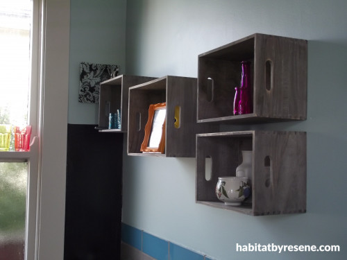 Glenn's latest addition is this quirky collection of painted crate shelves for the kitchen, set against walls in Resene Opal.