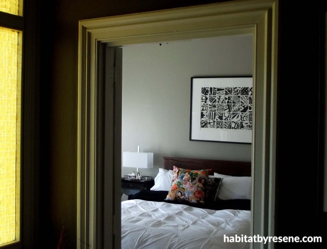 Adventurous homeowner Glenn London is certainly a man who develops a passion for colours. At the moment Resene Ipanema (a caustic yellow) is his new favourite accent colour and he has decided that, for him, Resene Ash “is the new Tea”, referring to the fact that Resene Tea has been such a huge hit for those seeking a character-filled neutral. It's used in Resene Half Ash strength in the bedroom above, seen through the Resene Triple Masala walls of the hallway.