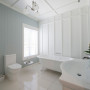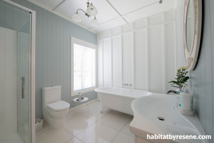 The bathroom of the house by David Wraight Cottages uses soft Resene Hermitage blue with a board and batten wall in Resene Quarter Cararra. Image by Juliet Nicholas.