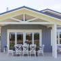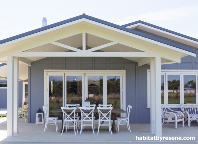 This new build home wouldn't be remiss in the Hamptons with its Resene Quarter Grey Friars exterior, crisp Resene Black White trims and Cape Cod-style outdoor furniture. See more about this house here.