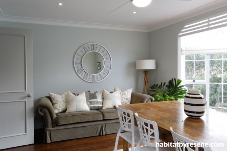 Designer Kelly Gammie of Eucalyptus Design transformed this tired 1980s home into a chic Hamptons-style abode. The homeowners wanted a Hamptons-meets-New Zealand look, with Resene Half Duck Egg Blue in the living and dining room. See the rest of the home here. Image by Becky Nunes.