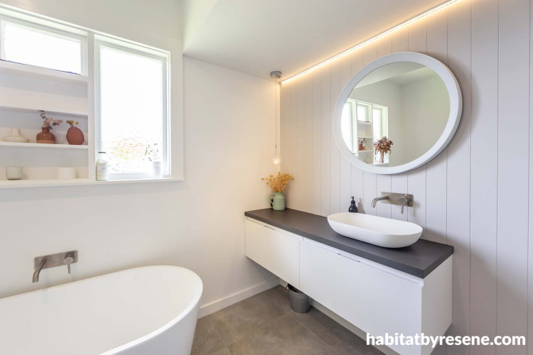 The bathroom received an elegant update with Resene Quarter Rice Cake on the walls, ceiling and trim. The panelled feature wall created a point of difference in Resene Whiteout.