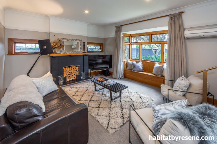 The couple created a homely atmosphere in the lounge with lower walls in Resene Half Napa and ceiling and upper walls in Resene Half Rice Cake.
