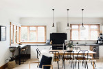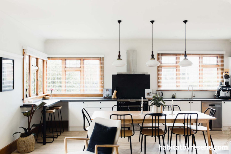 After: The couple created a sophisticated open plan kitchen and dining space that glows with walls in Resene Half Rice Cake.