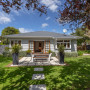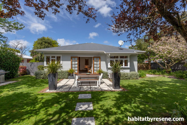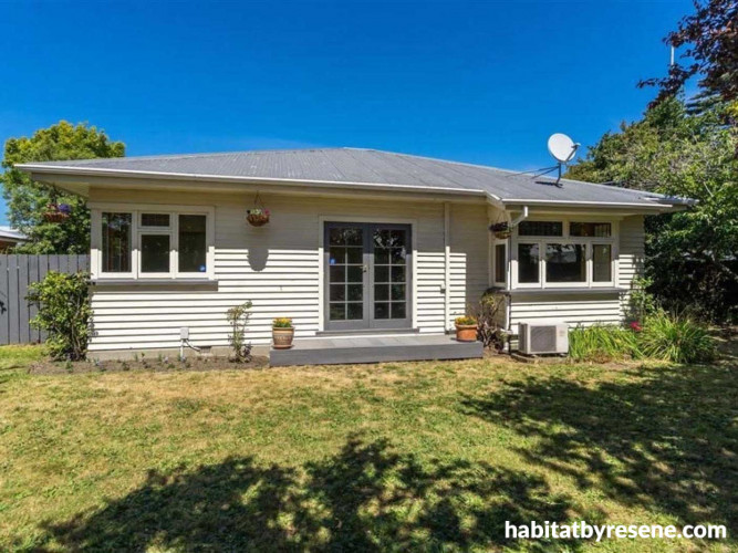 After: The couple painted their home’s exterior weatherboards in Resene Midwinter Mist and trim in Resene Grey Friars and created a stylish outdoor patio.