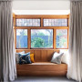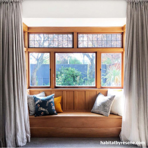 In the lounge, the couple revived this beautiful reading nook with Resene Half Rice Cake on the walls and ceiling to complement the timber features.