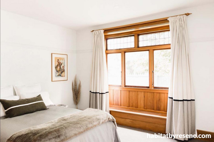 Resene Half Rice Cake walls in the bedroom lifted the room, complementing the timber accents and the couple’s homemade curtains.
