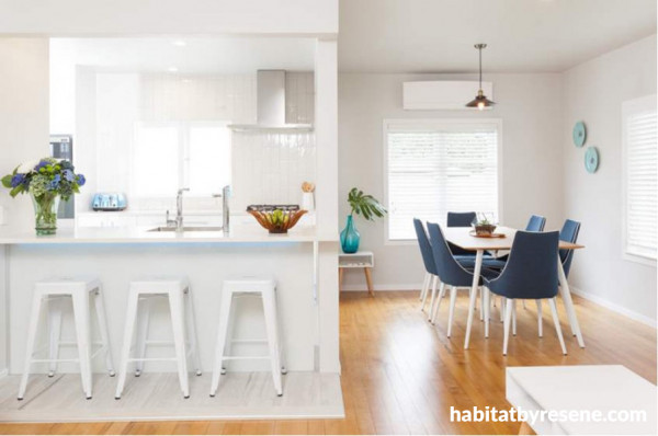 A crisp fresh colour scheme based on Resene Sea Fog certainly gives Mick and Kathy's kitchen and dining area a bright and breezy feel. Photo supplied.