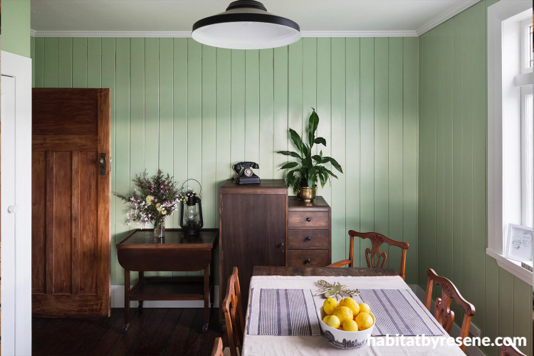 Homeowners Jane and Pim used calming Resene Norway for the walls of the dining room in their century-old villa. The ceiling and trims create a greater sense of space and are painted in Resene Quarter Villa White. Image by Jessica Gernat.