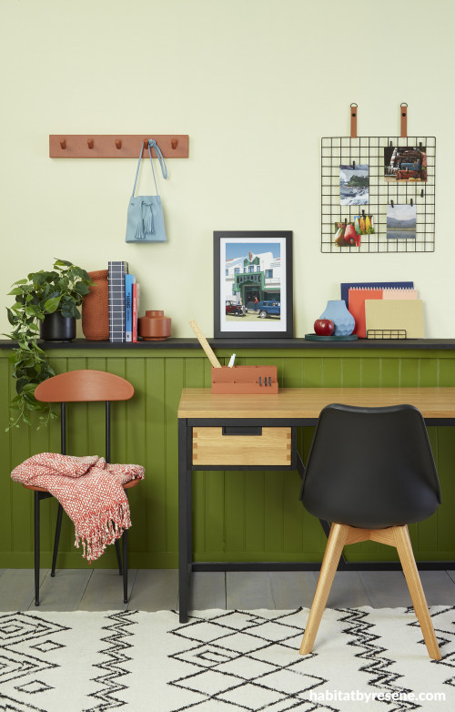 Wall in Resene Moonlight and tongue-and-groove panelling in Resene Untamed. Shelf (on top of panelling) in Resene Noir, floor in Resene Colorwood Mid Greywash and spare chair in Resene Moccasin and Resene Noir. Hooks, pencil holder and tall textured vase in Resene Moccasin, round dimpled vase in Resene Mystery, low plate (with apple) in Resene Family Tree, table in Resene Noir with Resene Family Tree legs and chair in Resene Pohutukawa. Desk and rug from Freedom Furniture, throw from Nood, pencil holder and hook set from Kmart, artwork by Contour Creative Studio from Endemic World, purse from Miniso. Project by Laura Lynn Johnston, image by Bryce Carleton