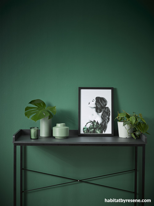 Our hallways deserve just as much love as the rest of the house. This wall glows in Resene Mother Nature and the desk is in Resene Noir. The vase is in Resene Peace and the pot plant is in Resene Silver Chalice. Vase from Shut the Front Door, artwork Linn Wold from Popmotif. Project by Vanessa Nouwens, image by Melanie Jenkins.