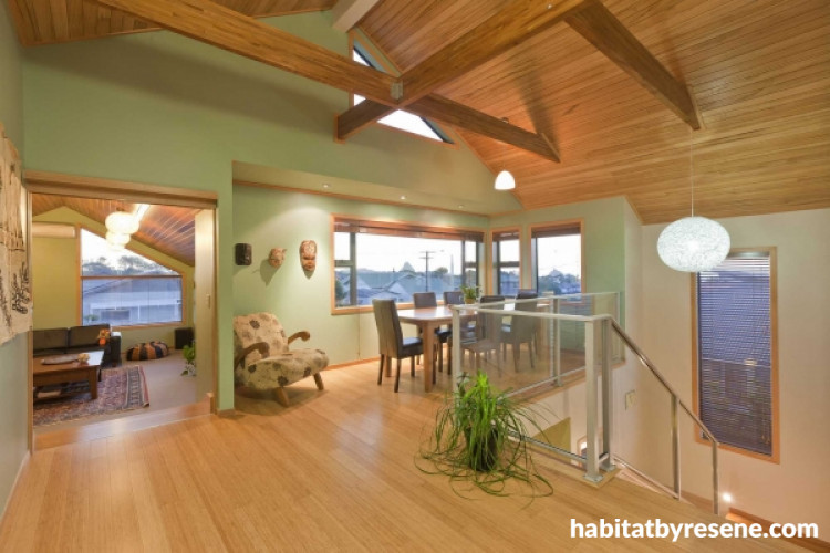 What colours did you use? We used Resene Spanish Green in the dining area and lounge, Resene Lemon Grass in the entrance foyer, and Resene Tea in the kitchen and living area and stairwell. We had used Resene Tea before and liked the look. All of the colours we used go well with lots of other colours. They are natural colours that go well with the sustainable timbers used throughout the house.