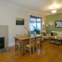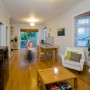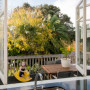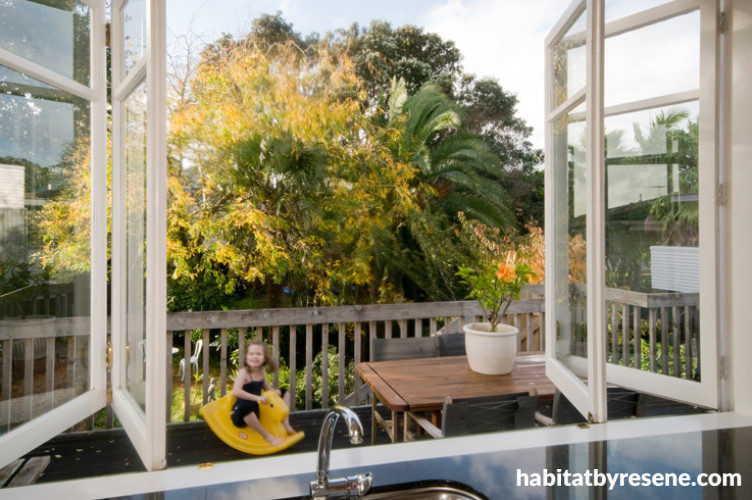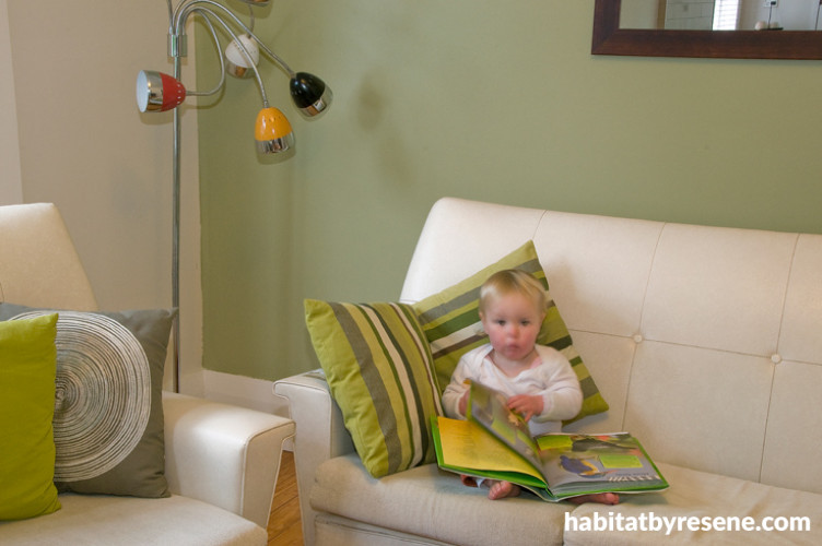 The living room opens on to the back deck and garden, which inspired the green feature wall.